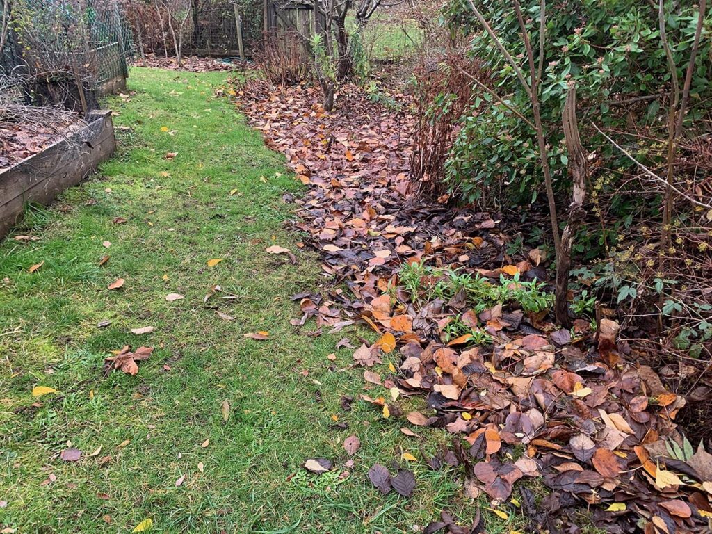 Apply a 2–4 inch layer of mulch (such as loose leaves- ideally deciduous leaves i.e. Large leaf maple, not waxy leaves i.e. laurels) to retain moisture, suppress weeds, and enrich the soil.