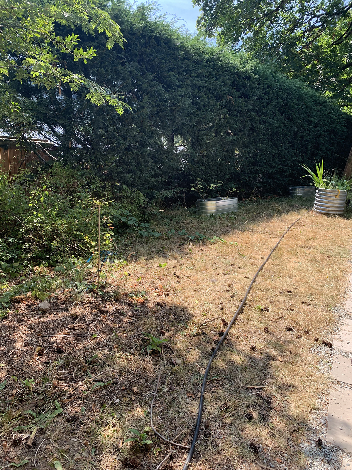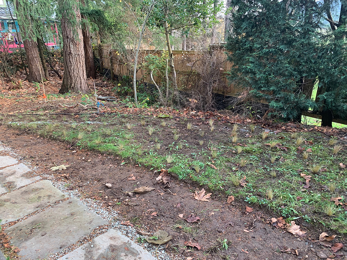Native grasses, not flowers, are the focus here. Anne wanted to primarily plant  native bunch-grasses as an alternative to lawn, lowering maintenance and water requirements. Her backyard is bordered by a large cedar hedge on the south side, which casts deep shadows by mid-to-late afternoon in the summer. One end of the garden bed is also shaded for much of the day by an enormous large-leaf maple tree.