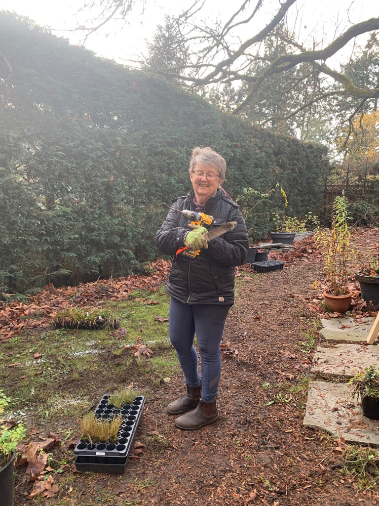 Instead of smothering the existing grass with cardboard, Anne wanted to plant directly into the soil without removing the existing grass or weeds. The hope is that the bunchgrass will grow over top of it. To make planting easier, Anneโ€™s partner suggested using a drill to create the planting holes, and what a difference it made! I expanded the hole a little bit with a trowel and popped the plug in, tucking soil around it. I will certainly use this method in the future to speed up the planting process.