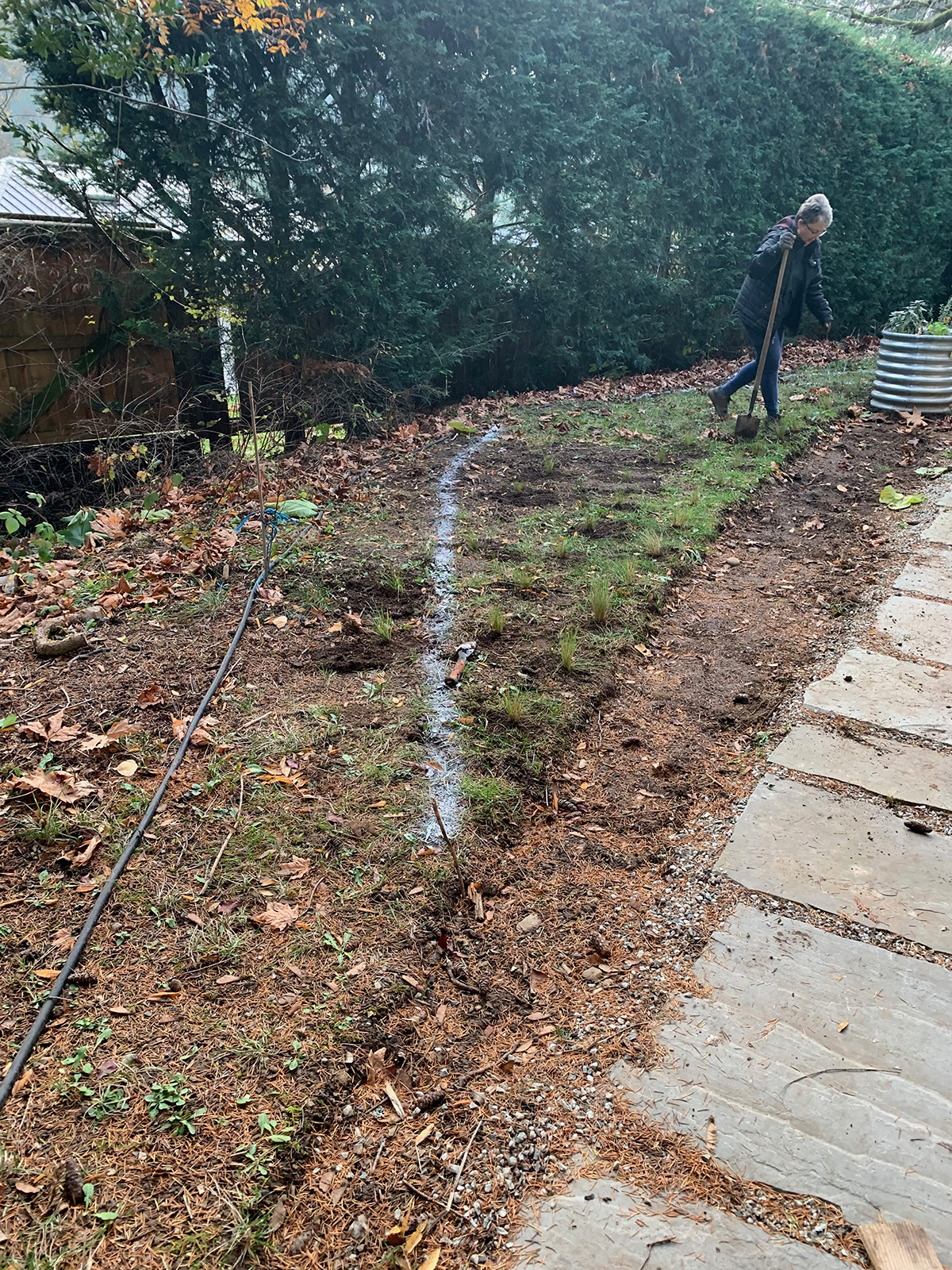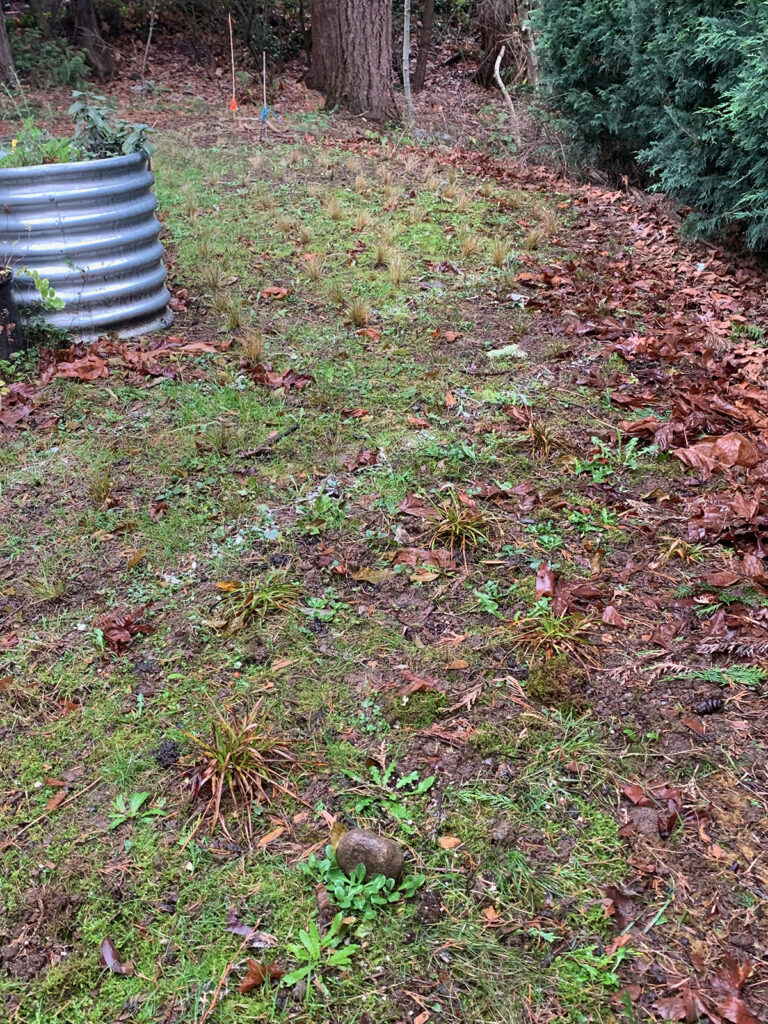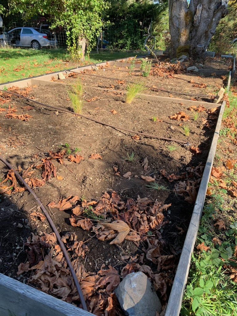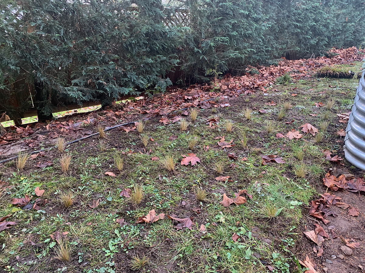 Due to restraints of their plant budget and the large bed, some of the plants are spaced far apart; I will be interested to see how long it takes them to fill in the open spaces. I deliberately did not add leaves as mulch, as the large-leaf maple drops an enormous amount on the bed, and will easily provide an excellent mulch to protect the plants from the cold weather, and save me from finding a different leaf source.