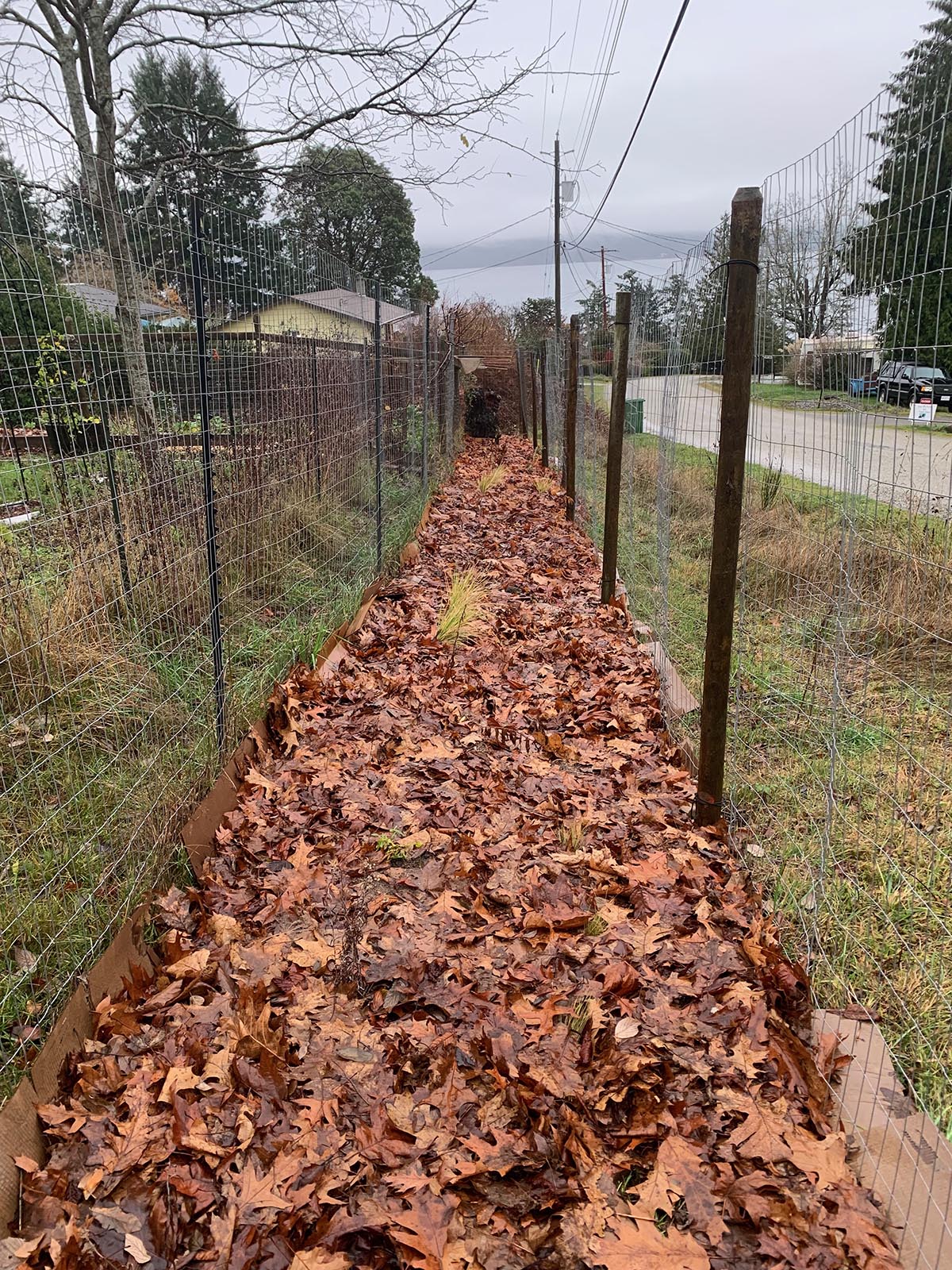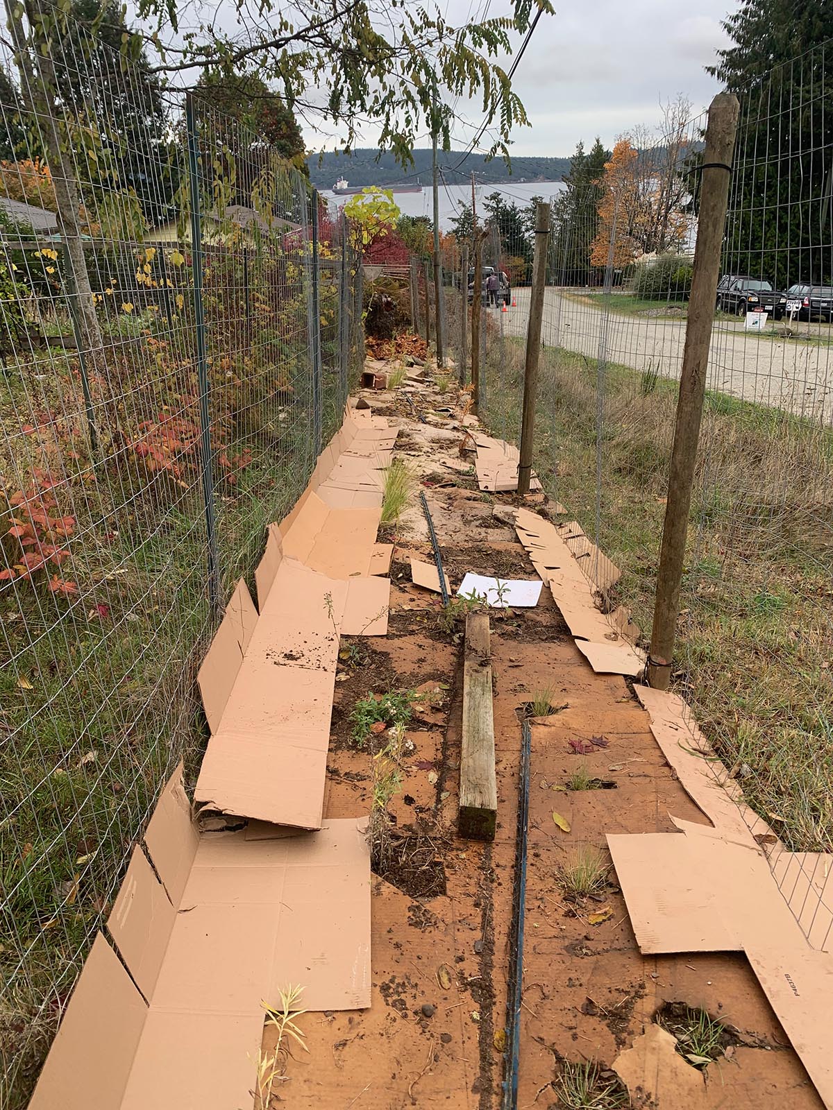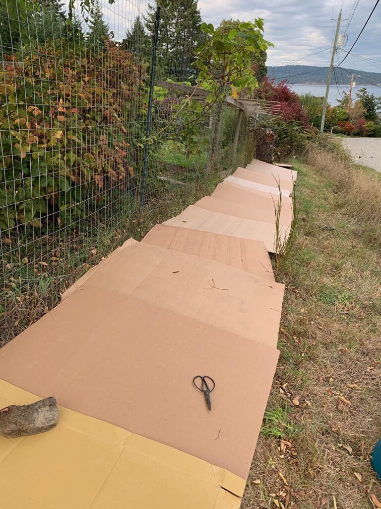 I returned to lay more cardboard down to dissuade the grasses creeping through the fences on either side of the bed. Ongoing grass maintenance will be necessary: weed-whacking with a trimmer, manual removal, and perhaps even more cardboard!