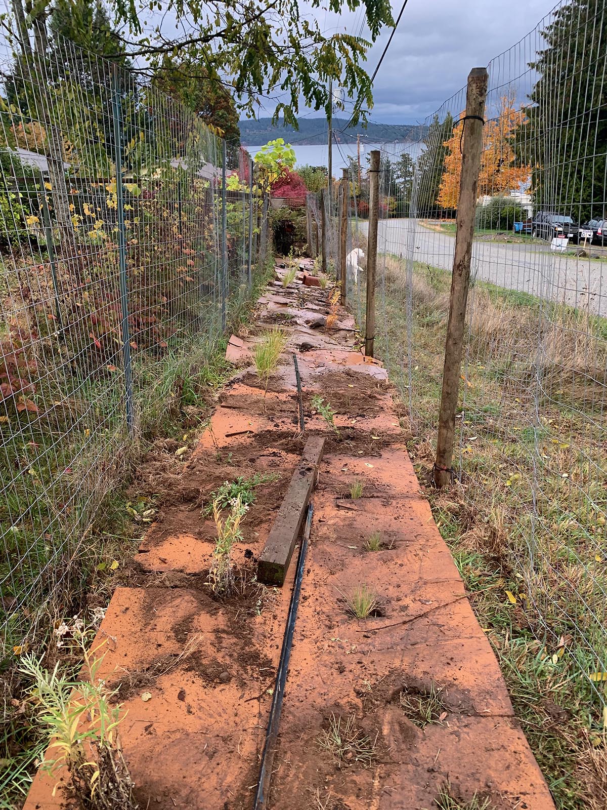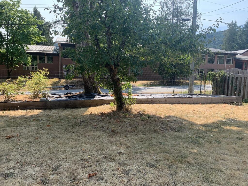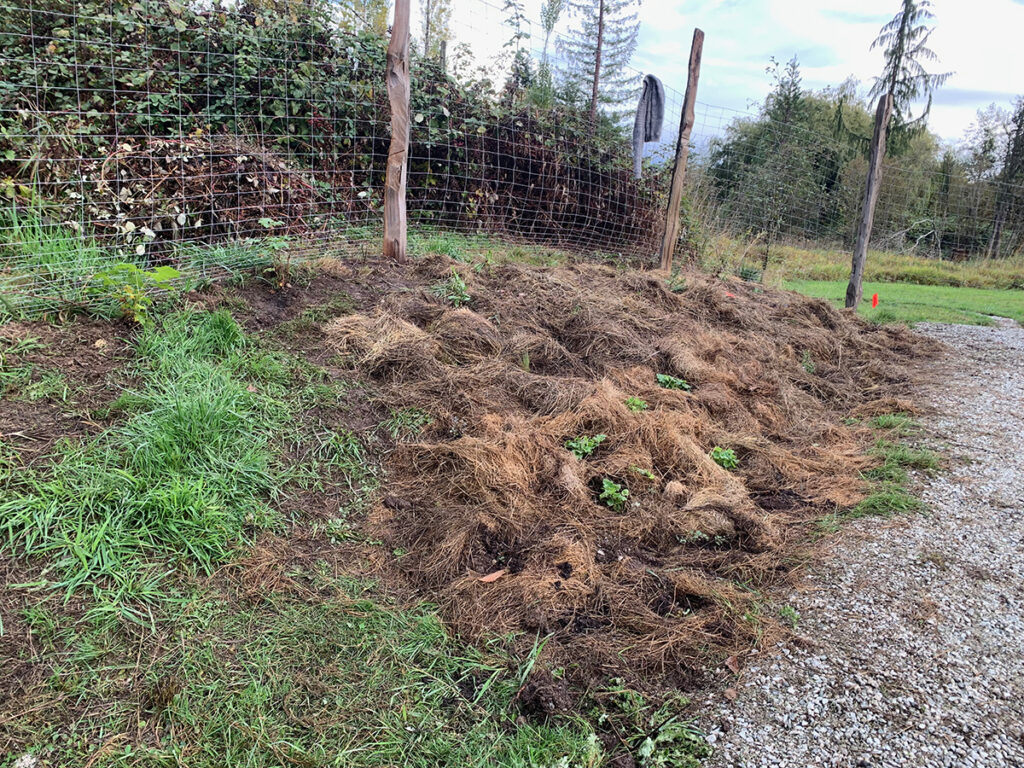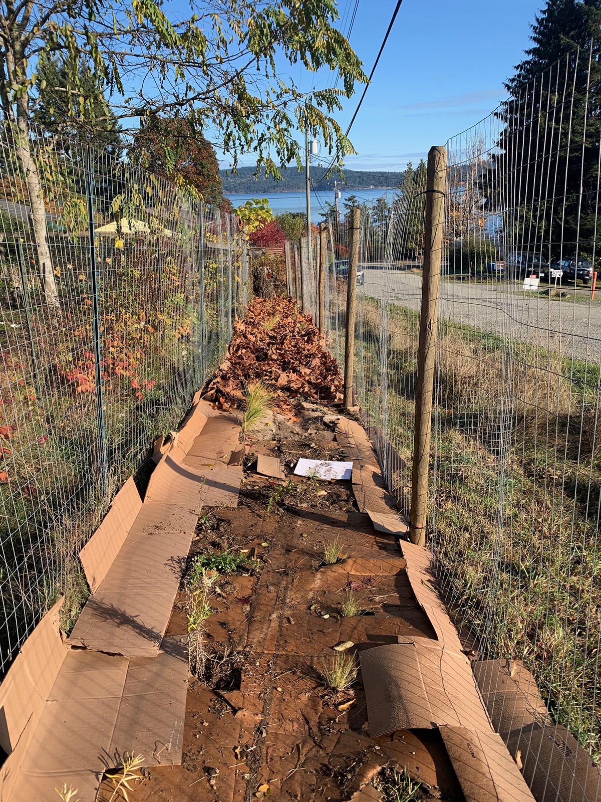I returned to lay more cardboard down to dissuade the grasses creeping through the fences on either side of the bed. Ongoing grass maintenance will be necessary: weed-whacking with a trimmer, manual removal, and perhaps even more cardboard!