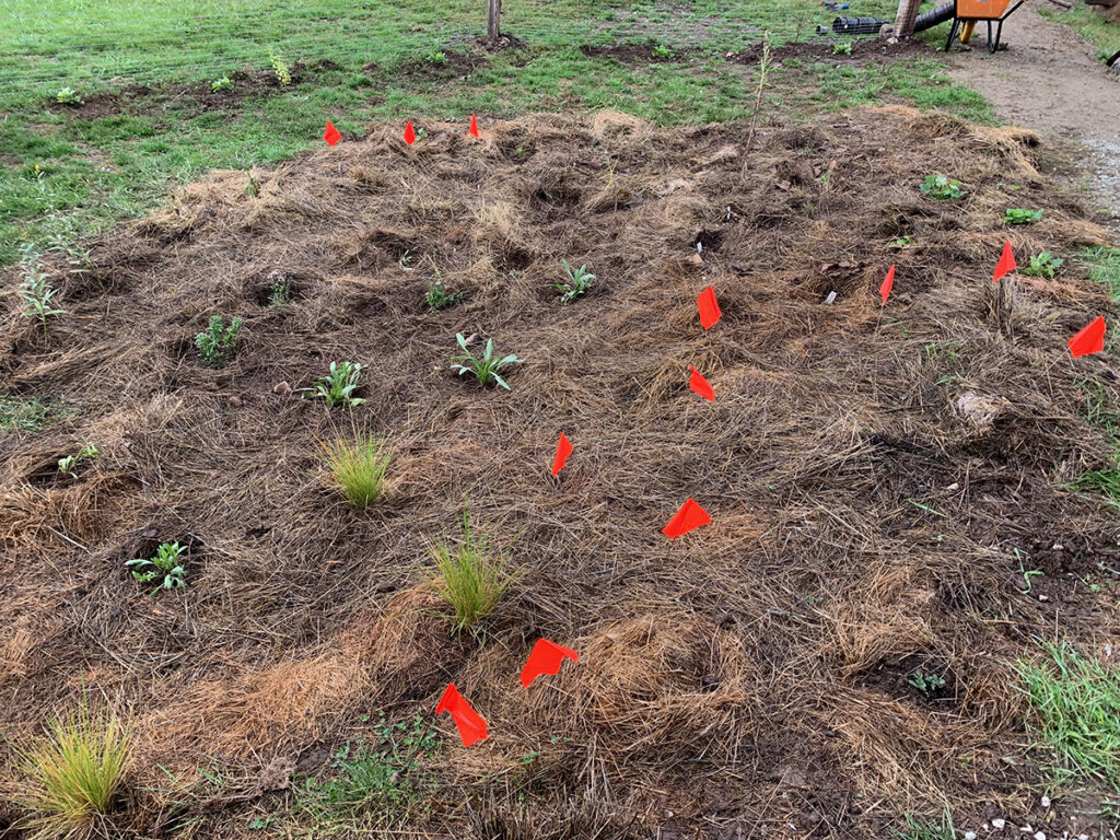Four gardens were chosen: one is across from the loading zone at the local high school; the second is at The Root, our local farmland trust; and the third is on a busy street with many families and the fourth breaks the rules by being a grass garden rather than a meadow in a private garden. Ideally, I would have loved to also plant trees and larger shrubs, but that wasnโ€™t possible due to space constraints. I did manage to get smaller shrubs into 3 of the gardens. Shrubs provide habitat and/or food for pollinators as well as adding height that provides visual interest, drawing the viewerโ€™s eye across the garden bed.