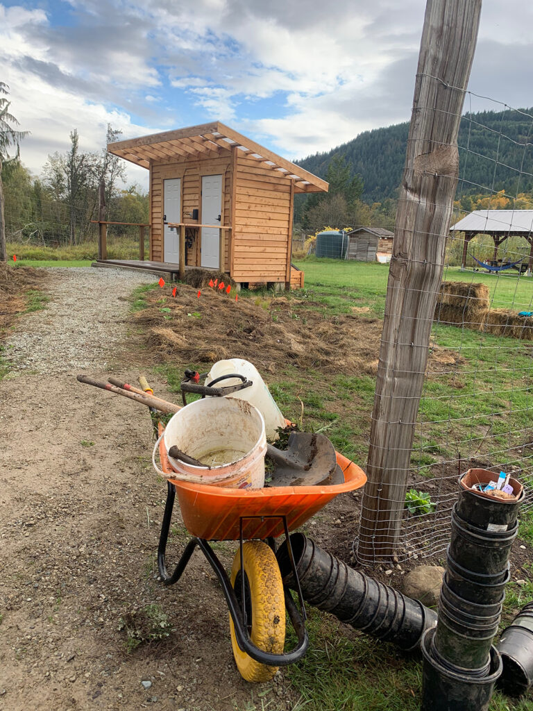 The beds at The Root’s community garden were composed of two half-moon beds in full sun with 25โ€™ long edges on either side of a pathway leading to their beautiful new composting toilet.
